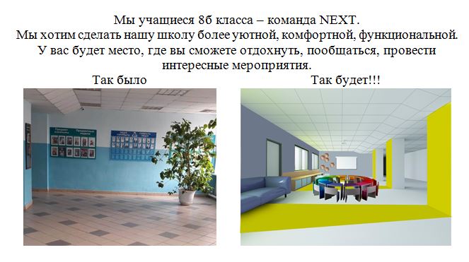 Обучающиеся МБОУ башкирский лицей принимают участие в разработке проектов по инициативному школьному бюджетированию. 5 команд лицея выдвигали на голосование свои проекты, направленные на улучшение условий для обучения и досуга ребят. В ходе голосования победил проект команды "Next". Результатам реализации проекта станет зона свободного общения, в которой ребята смогут проводить лекции, семинары, организовывать просмотр видеороликов и просто приятно общаться на переменах.