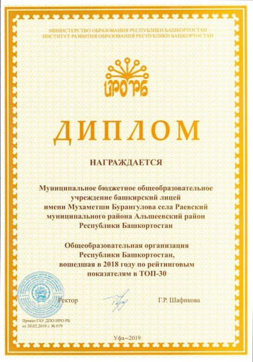 В результате проведенного мониторинга были определены 30 лучших образовательных организаций республики. В их числе общеобразовательное учреждение МР Альшеевский район МБОУ башкирский лицей имени Мухаметши Бурангулова.