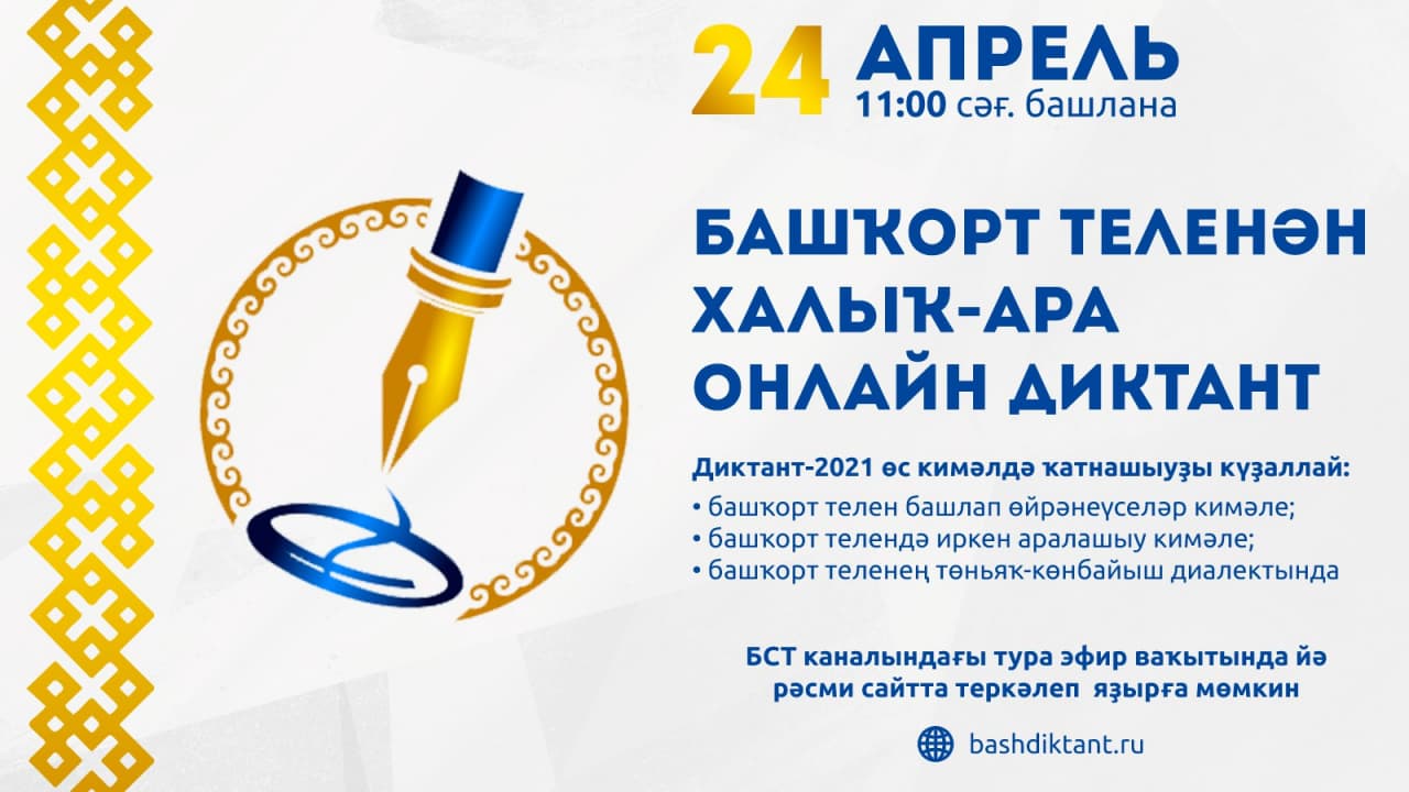24 апрель сәғәт иртәнге 11:00 «Башҡортостан юлдаш телевидениеһы» телеканалында, «Бәйләнештә» социаль селтәрҙәрендә, «YouTube» видеохостингында тура эфирҙа Башҡорт телендә халыҡ-ара диктант яҙыуҙа көтөп ҡалабыҙ!